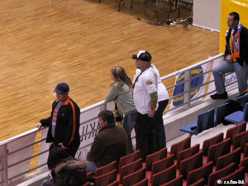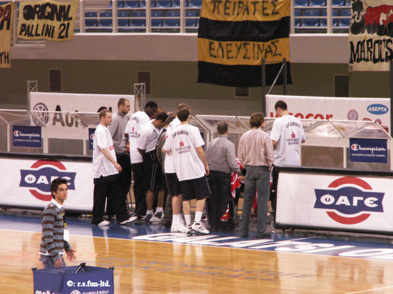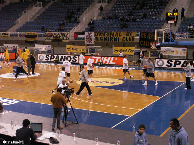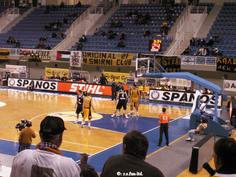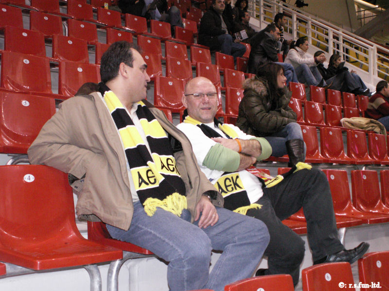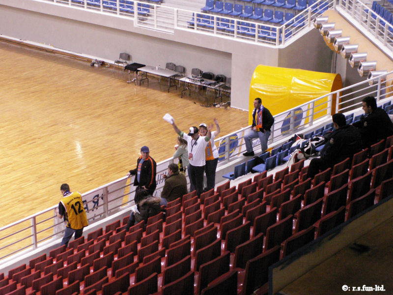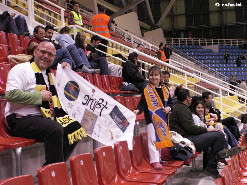 Leider waren nur ca. 150 (!!!) griechische Fans in der Halle, es wurde uns von Griechen erzählt, dass der Sponsor die Mannschaft nicht mehr wie letztes Jahr unterstützt, und deshalb der Erfolg nicht mehr so groß ist, zum anderen viele Fans sauer sind, dass einige Publikumslieblinge nicht gehalten wurden, und deshalb die Fans die Spiele boykottieren |